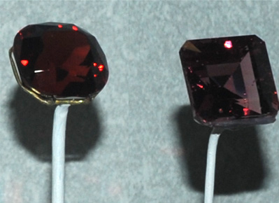 These spinel gems are 36.1 and 34.1 carats and are from Burma. "It is easy to confuse red spinels with rubies. They are found in similar places and have similar properties. The Black Prince Ruby in the British Crown Jewels is really a spinel! Impurities create many colors of spinel; red from chromium is the most prized."