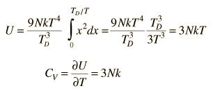 with the modes and summing over the modes, Debye was able to find an expression for the energy as a function of temperature and derive an expression for the specific heat of the solid. In this expression, vs is the speed of sound in the solid.