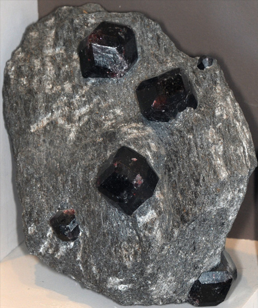 Esta es una muestra de esquisto con incrustaciones de almandino, procedente de Fort Wrengell, Alaska. Mide unos 25 x 30 cm.
